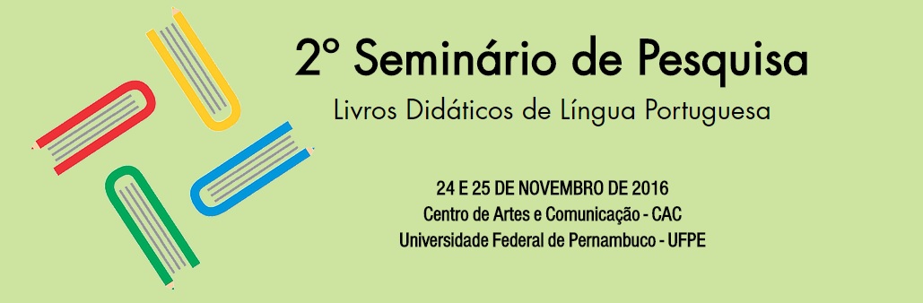 Nos dias 24 e 25 de novembro, ocorrerá o 2° seminário de pesquisa: Livros Didáticos de Língua Portuguesa na Universidade Federal de Pernambuco. No evento, haverá espaço para a apresentação de quatro pesquisas (em andamento ou concluídas) sobre os livros didáticos de Português, que serão selecionadas pelo Comitê Científico do evento.