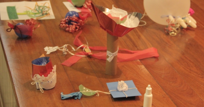 Uma experimentação prática foi proposta por Juliana para contribuir com o debate sobre a arte e a educação infantil: foram entregues saquinhos de papel que continham objetos variados, como fitas, luvas, figuras e cola e a dinâmica foi construir com aqueles itens um objeto novo que poderia conter qualquer significado. Por fim, as peças foram expostas no auditório, sendo observadas muitas cores e formatos diferentes.