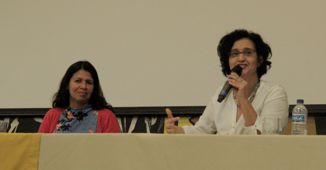 As professoras Iza Rodrigues (esquerda) e Isabel Oliveira comporam a mesa do primeiro dia