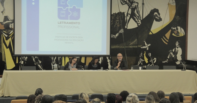 Antes de iniciar a primeira aula, o professor da FaE e coordenador do curso pelo Ceale Gilcinei Carvalho convidou a diretora da FaE Daisy Cunha e a professora Vânia Machado, gerente de coordenação da Educação Infantil da Prefeitura de Belo Horizonte (PBH), para darem boas-vindas aos cursistas.