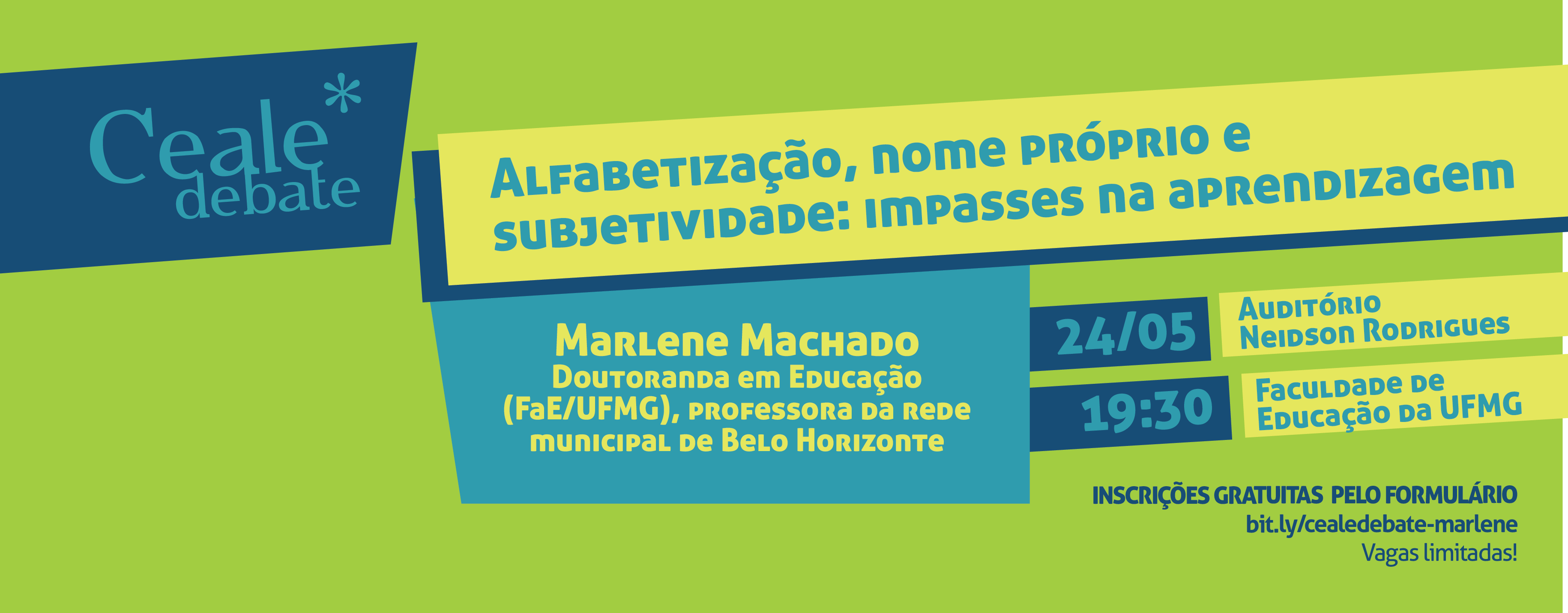 O que impede que algumas crianças aprendam, apesar das estratégias diferenciadas, da mudança de metodologias, professores, projetos e até de escola? O que persiste como impasse na trajetória da criança, na construção da escrita e de outras aprendizagens? Para discutir essas e outras questões, a partir de uma perspectiva psicanalítica, o Ceale Debate de maio convida a pesquisadora Marlene Machado, que falará sobre o tema "Alfabetização, nome próprio e subjetividade: impasses na aprendizagem". O evento será realizado no dia 24 de maio (quarta-feira), das 19h30 às 21h30, no Auditório Neidson Rodrigues da Faculdade de Educação da UFMG, campus Pampulha (Avenida Antonio Carlos, 6.627).