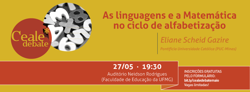 Ao brincar, ao manipular objetos e, principalmente, ao falar sobre o que está fazendo, a criança aprende Matemática. Para discutir as diferentes linguagens envolvidas no processo de aquisição de conhecimentos matemáticos na infância, o Ceale Debate convida no mês de maio a professora Eliane Scheid Gazire, que discutirá o tema "As linguagens e a Matemática no ciclo de alfabetização". A palestra ocorre no próximo dia 27 (quarta-feira), das 19h30 às 21h30, no Auditório Neidson Rodrigues da Faculdade de Educação da UFMG (Campus Pampulha). As vagas são limitadas e a inscrição, gratuita, deve ser feita pelo preenchimento do formulário disponível em: bit.ly/cealedebatemaio