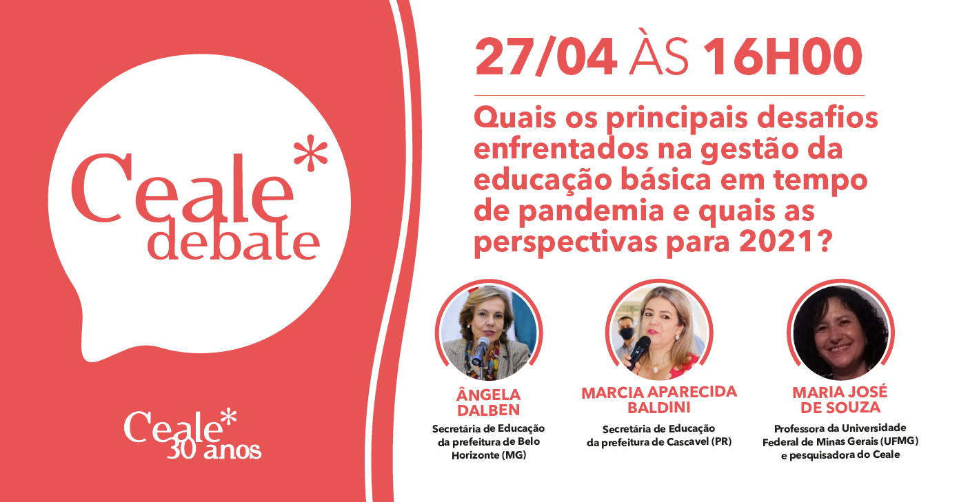 No dia 27 de abril, terça-feira, às 16h, ocorre o Ceale Debate do mês de abril, que abordará o tema "Quais os principais desafios enfrentados na gestão da educação básica em tempo de pandemia e quais as perspectivas para 2021?". O Ceale segue com o formato de live neste ano devido à pandemia da covid-19.