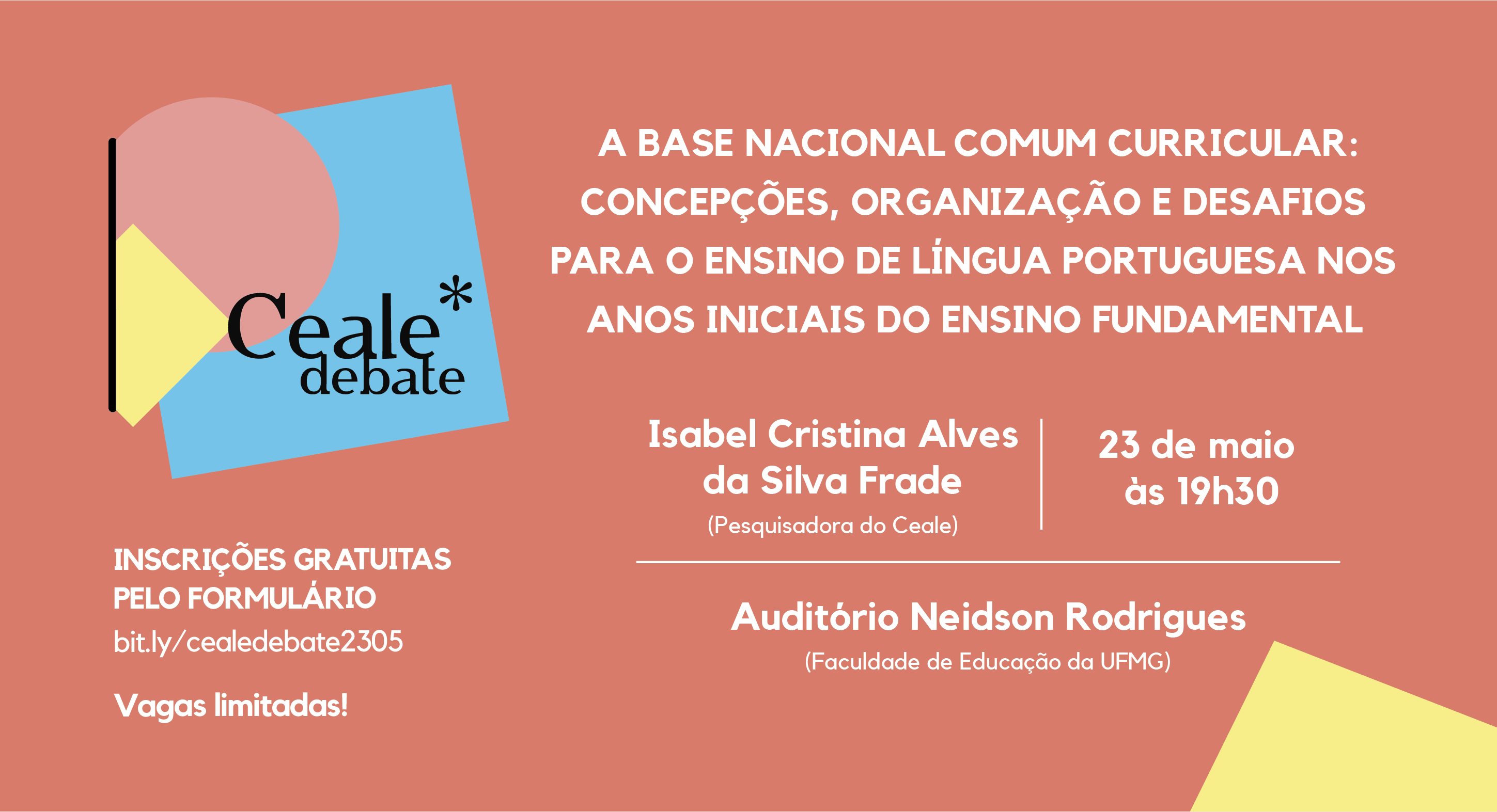 Estão abertas as inscrições para o Ceale Debate de maio, que abordará o tema "A Base Nacional Comum Curricular: concepções, organização e desafios para o ensino de Língua Portuguesa nos anos iniciais do Ensino Fundamental". A convidada é a pesquisadora e ex-diretora do Ceale Isabel Frade. O evento ocorre no dia 23 de maio (quarta-feira), das 19h30 às 21h30, no Auditório Neidson Rodrigues da Faculdade de Educação da UFMG, no campus Pampulha (Avenida Antônio Carlos, 6.627).