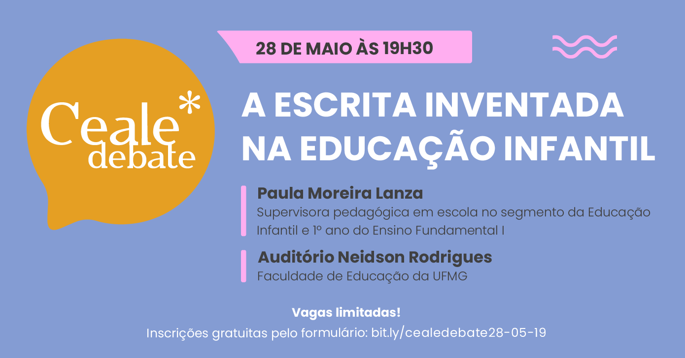 Estão abertas as inscrições para o Ceale Debate de maio, que abordará o tema "A Escrita Inventada na Educação Infantil". A convidada é Paula Moreira Lanza, supervisora pedagógica em escola no segmento da Educação Infantil e 1º ano do Ensino Fundamental I. O evento ocorre no dia 28 de maio (terça-feira), das 19h30 às 21h30, no Auditório Neidson Rodrigues da Faculdade de Educação da UFMG, no campus Pampulha (Avenida Antônio Carlos, 6.627).