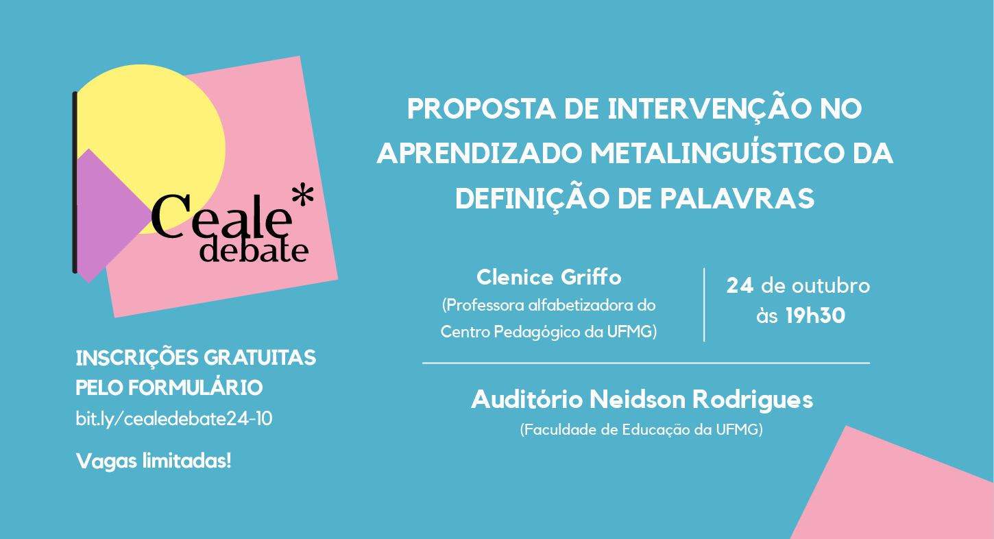 Estão abertas as inscrições para o Ceale Debate de outubro, que abordará o tema "Proposta de intervenção no aprendizado metalinguístico da definição de palavras". A convidada é a professora do Centro Pedagógico da UFMG Clenice Griffo. O evento ocorre no dia 24 de outubro (quarta-feira), das 19h30 às 21h30, no Auditório Neidson Rodrigues da Faculdade de Educação da UFMG, no campus Pampulha (Avenida Antônio Carlos, 6.627).