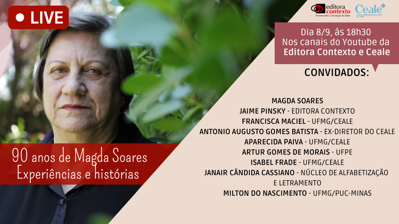 No dia 08 de setembro, Dia Mundial da Alfabetização, às 18:30, a Editora Contexto realizará uma live em homenagem aos 90 anos de Magda Soares, professora emérita da Faculdade de Educação da UFMG e uma das fundadoras do Ceale. A live terá a participação de 8 professores convidados e da própria homenageada. Dentre os convidados estão pesquisadores do Ceale, que vão falar um pouco sobre suas experiências de trabalho com Magda.