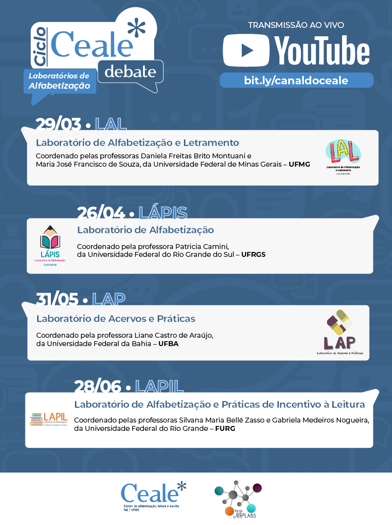 Neste mês de março, terá início o "Ciclo Ceale Debate Laboratórios de Alfabetização" que, ao longo dos meses de março, abril, maio e junho, apresentará quatro laboratórios que compõem a Rede AlfaLabs, destacando o papel por eles desempenhado na formação inicial e continuada de docentes.