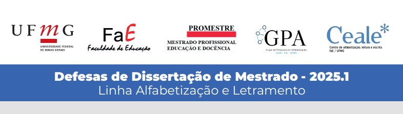 O Centro de Alfabetização, Leitura e Escrita (Ceale) divulga as datas e horários das defesas das dissertações e dos Produtos Educacionais da linha de pesquisa Alfabetização e Letramento do Mestrado Profissional em Educação e Docência (PROMESTRE), da Faculdade de Educação da UFMG.