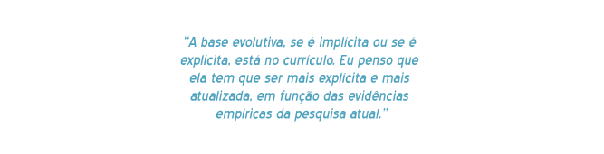 O processo de aprendizagem é um processo psicológico e tem uma restrição evolutiva importante. Restrição no sentido de quais elementos são importantes de se aprender a cada etapa da vida. A base evolutiva, se é implícita ou se é explícita, está no currículo. Eu penso que ela tem que ser mais explícita e mais atualizada, em função das evidências empíricas da pesquisa atual. Por exemplo, de 0 a 3 anos, é muito importante a atenção conjunta e o início da compreensão da intencionalidade. Para compreender a linguagem, e para o processo de aquisição de conhecimentos, é importante o início do desenvolvimento das emoções, assim como é importante o jogo simbólico para desenvolvimento da representação simbólica – o desenho. Tudo isso é evolutivo. Já de 3 a 5 anos, é importante a compreensão mental do outro, das crenças, do pensamento, das emoções... Tudo isso é muito importante para a linguagem, para a cognição, para tudo. A base evolutiva é super importante, ainda mais quando são pequenos. Depois, maiores, o peso evolutivo é mais relativo. Mas, de 0 até 10, 11 anos, isso é muito forte. Por isso acho que o conhecimento da psicologia é importante. A psicologia cognitiva do processo de aquisição. Mas na formação do professor não há matérias desse tipo. Como também não há matérias sobre linguagem. Os professores não sabem como ensinar a língua, não têm informação, então é preciso ajudá-los.