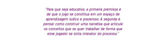 A primeira premissa é a de que o jogo se constitua em um espaço de aprendizagem lúdico e prazeroso. A primeira grande ideia é preservar o essencial do jogo: ser divertido. A grande crítica, quando crianças e adolescentes falam dos jogos educativos, é que os acham enfadonhos e chatos. O povo acha que, porque é educativo, deve ter só conteúdo, deve ser igual ao que a escola faz.