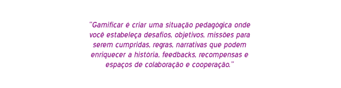 Essa mecânica dos jogos também está presente em outra coisa que virou moda, que é a "gamificação". Gamificar é usar essa lógica para criar estratégias pedagógicas, que não necessariamente precisam ter o jogo digital ou analógico para isso; é criar uma situação pedagógica onde você estabeleça desafios, objetivos, missões para serem cumpridas, regras, narrativas que podem enriquecer a história, feedbacks, recompensas e espaços de colaboração e cooperação.