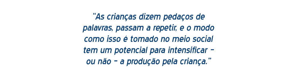 As crianças dizem pedaços de palavras, passam a repetir, e o modo como isso é tomado no meio social tem um potencial para intensificar – ou não – a produção pela criança. Uma palavra não é só um som, ela carrega em si um significado. Quando a criança fala pela primeira vez – ou pelas primeiras vezes – uma palavra, não significa que já compreende o seu significado, [apenas] pelo fato de conseguir pronunciá-la corretamente ou quase corretamente. Quando ela aponta e diz ‘au-au’, ou ‘mamãe’, não significa que já saiba o que significa uma mãe, um cachorro. Ela vai necessitar de um tempo de experiências para elaborar essa palavra em outro contexto, para que essa palavra vá ganhando a sua função de categorização, encerrando ali uma generalização social. Quando a gente diz ‘mãe’, ali está uma generalização social: é uma referência a todas aquelas criaturas que se inserem naquela categoria que as difere para nomearmos alguém como sendo mãe.