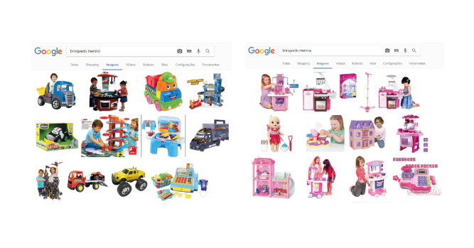 Resultados no Google Imagens: para a busca ‘brinquedo menino’ (imagem acima), muitos veículos em cores diversas; na busca ‘brinquedo menina’ (abaixo), prevalecem objetos ligados a tarefas domésticas, na cor rosa