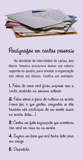 A professora Ana Maria Teixeira, do ciclo de alfabetização da Escola Municipal Maria de Rezende Costa, em Belo Horizonte (MG), também busca desenvolver a habilidade da paragrafação nos anos iniciais. No ano passado, a questão foi trabalhada em um projeto de intercâmbio de cartas entre alunos do 3º ano de escolas distintas, que passaram a compartilhar por escrito experiências de seus cotidianos.