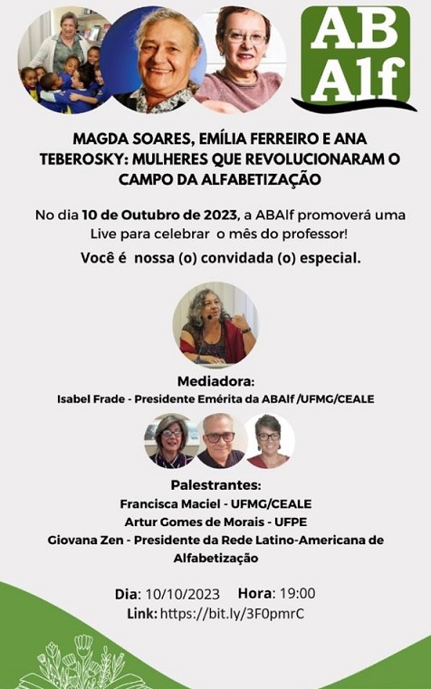 No próximo dia 10 de outubro, às 19h, a Associação Brasileira de Alfabetização (ABalf) realiza a live "Magda Soares, Emília Ferreiro e Ana Teberosky: mulheres que revolucionaram o campo da alfabetização" . O evento é uma homenagem ao mês do professor e será mediado pela pesquisadora do CEALE e presidente emérita da ABalf, Professora Isabel Frade. Então os palestrantes, haverá a presença da também pesquisadora do CEALE Professora Francisca Maciel, além do Professor Artur Gomes de Morais (UFPE) e da Professora Giovana Zen, Presidente da Rede Latino-Americana de Alfabetização.