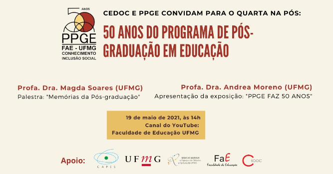 Hoje, às 14h, o Programa de Pós-Graduação em Educação da Faculdade de Educação da UFMG faz live para comemorar seus 50 anos. Magda Soares, professora emérita da FaE, fará uma palestra sobre "Memórias da Pós-Graduação".