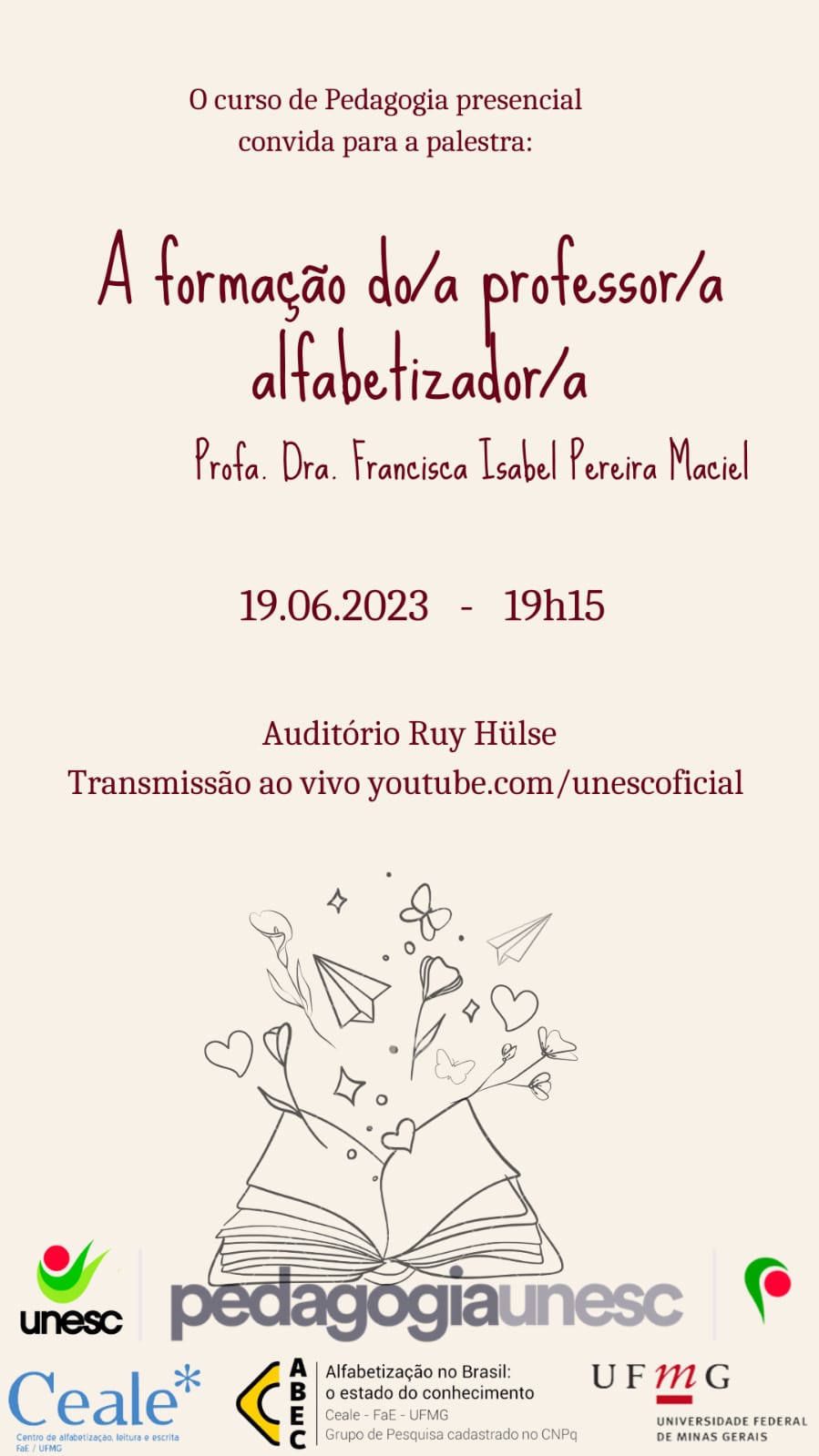 A professora da FaE/UFMG e pesquisadora do Ceale, Francisca Maciel, é convidada do curso de Pedagogia da Universidade do Extremo Sul Catarinense (UNESC) para uma palestra sobre "A formação do(a) professor(a) alfabetizador(a)". O evento será no dia 19/06, às 19h15, transmitido pelo canal do YouTube da UNESC: youtube.com/unescoficial.