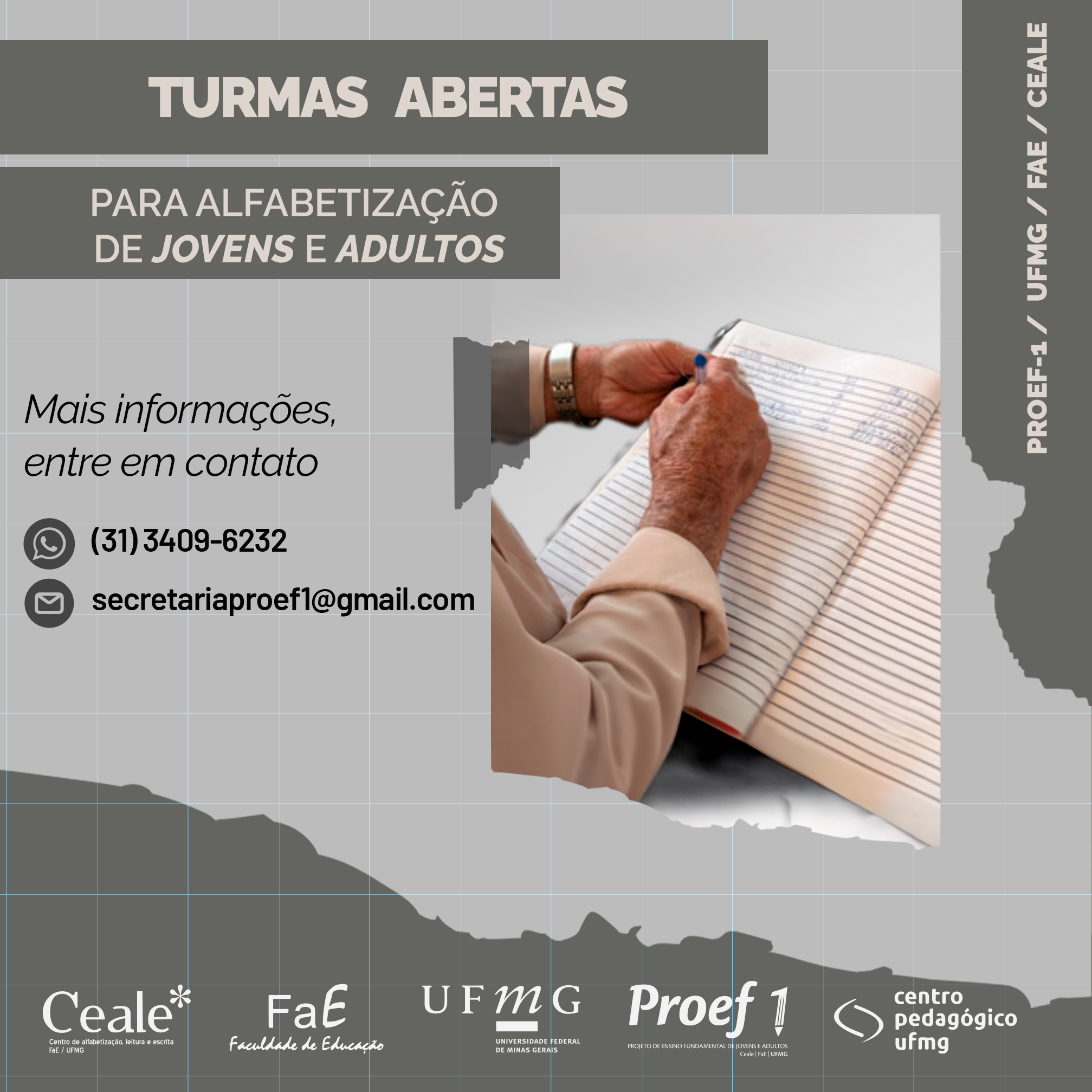 O Projeto de Ensino Fundamental para Jovens e Adultos (Proef-1), do Centro de Alfabetização, Leitura e Escrita (Ceale), anuncia a abertura das inscrições para as turmas de Alfabetização e Consolidação de 2024. A iniciativa é voltada para adultos e idosos que desejam iniciar ou retomar seus estudos e oferece uma oportunidade gratuita para o desenvolvimento educacional.