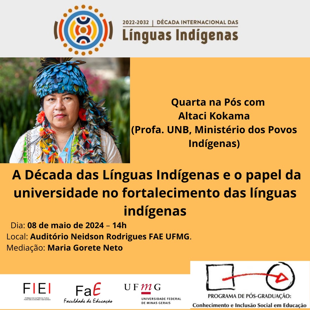Na próxima quarta-feira, dia 08 de maio, às 14h, o "Quarta na Pós" receberá a professora Altaci Kokama, da Universidade de Brasília, para falar sobre línguas indígenas e o papel da universidade. O evento será no auditório Neidson Rodrigues da FaE/UFMG, é aberto ao público e não é necessário inscrição.