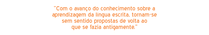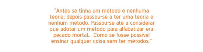 Essa idéia de retomar os métodos do passado faz parte daquela tendência tão comum, e tão enganosa, de considerar que antigamente tudo era melhor... Este recurso ao "antigamente" é sempre um caminho falso. No caso da alfabetização, é um caminho falso porque antigamente o fracasso também era grande, como continua a ser hoje. A diferença é que, antes, ele era concentrado na série considerada "de alfabetização": o aluno não ia para frente, não era aprovado enquanto não se alfabetizasse, e os índices de reprovação na primeira série eram altos. Agora, o fracasso se deslocou. Passou a se evidenciar no meio e muitas vezes até mesmo no fim do ensino fundamental: alunos que chegam às séries ou ciclos finais dessa etapa semi-alfabetizados ou até não alfabetizados. Assim, o argumento de que o método fônico, usado sobretudo nos anos 70, dava certo e, portanto, deve ser retomado, não se sustenta. Isso porque havia reprovação e não-aprendizagem com o método fônico, como havia também com outros métodos. Não tem sentido uma volta ao passado esquecendo ou abandonando as contribuições fundamentais do Construtivismo e das ciências lingüísticas para a compreensão do processo de aprendizagem da língua escrita. Um exemplo: antes, o menino escrevia silabicamente e as professoras diziam: "ele está engolindo letra, é disléxico, é preciso encaminhar para um psicólogo;" hoje, a teoria construtivista e os princípios lingüísticos evidenciam que escrever silabicamente é uma etapa normal do processo de descoberta do sistema de escrita. Fica claro como o avanço do conhecimento sobre a aprendizagem da língua escrita torna sem sentido propostas de volta ao que se fazia antigamente.