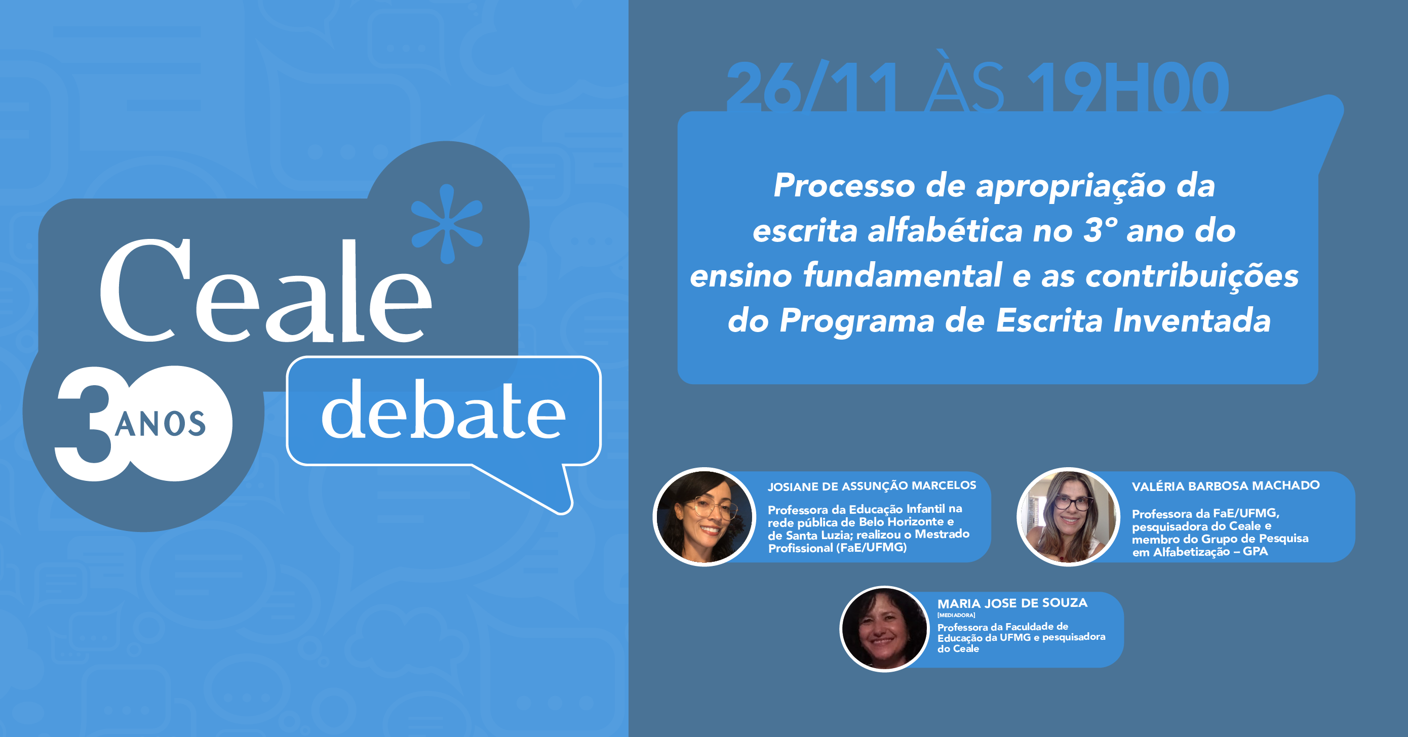 O Ceale Debate do mês de novembro contará com a presença da professora e integrante do Grupo de Pesquisa em Alfabetização –GPA/CEALE, membro da Associação Brasileira de Alfabetização – ABALF e do Núcleo Brasil - Rede Latino-Americana de Alfabetização, Josiane de Assunção Marcelos. Ela, juntamente à professora e orientadora do Mestrado Profissional (PROMESTRE) FaE\UFMG, Valéria Barbosa Machado, apresentará os resultados de sua pesquisa de mestrado sobre o processo de apropriação da escrita alfabética por crianças do 3º ano do Ensino Fundamental, egressas do ensino remoto durante a pandemia. A pesquisa também explora como o Programa de Escrita Inventada (PEI) contribuiu para superar desafios específicos da alfabetização.